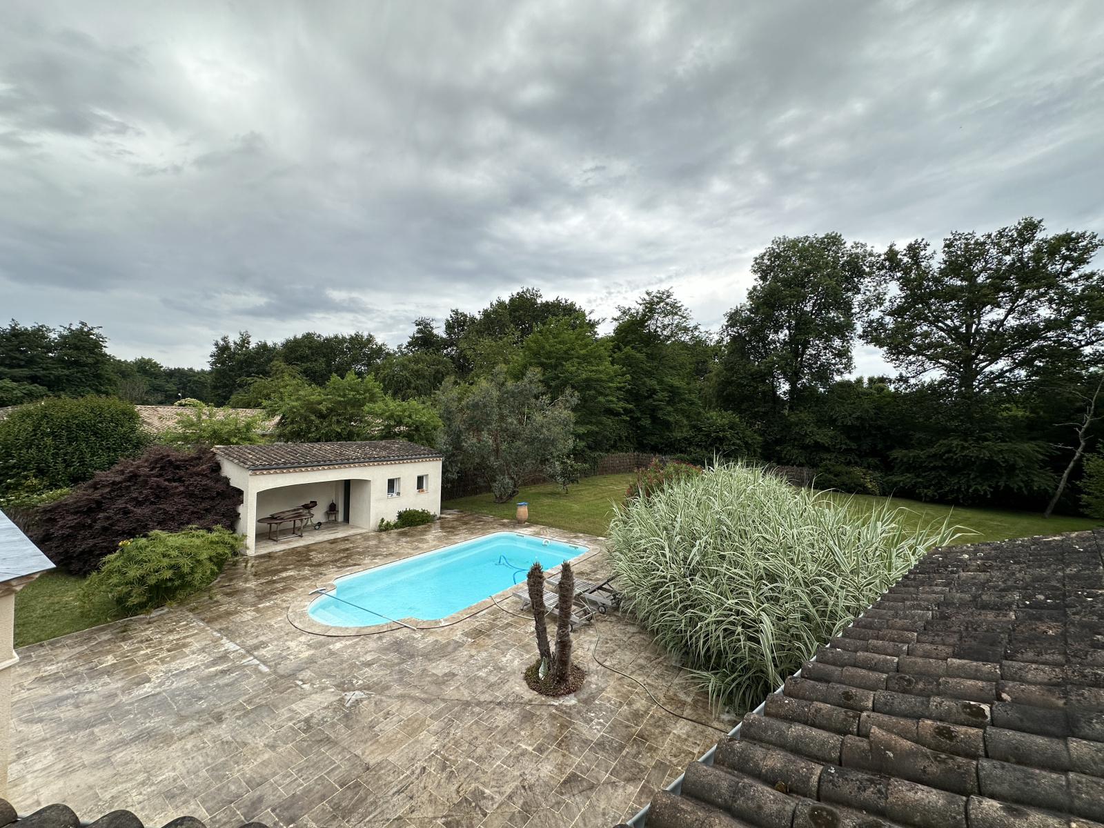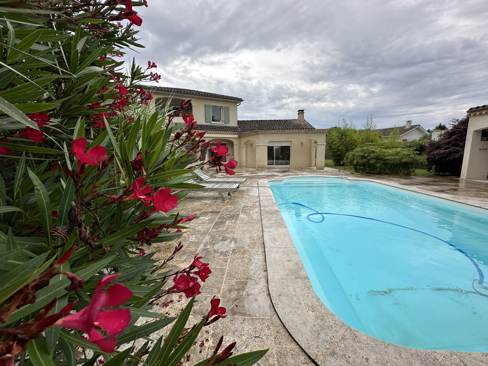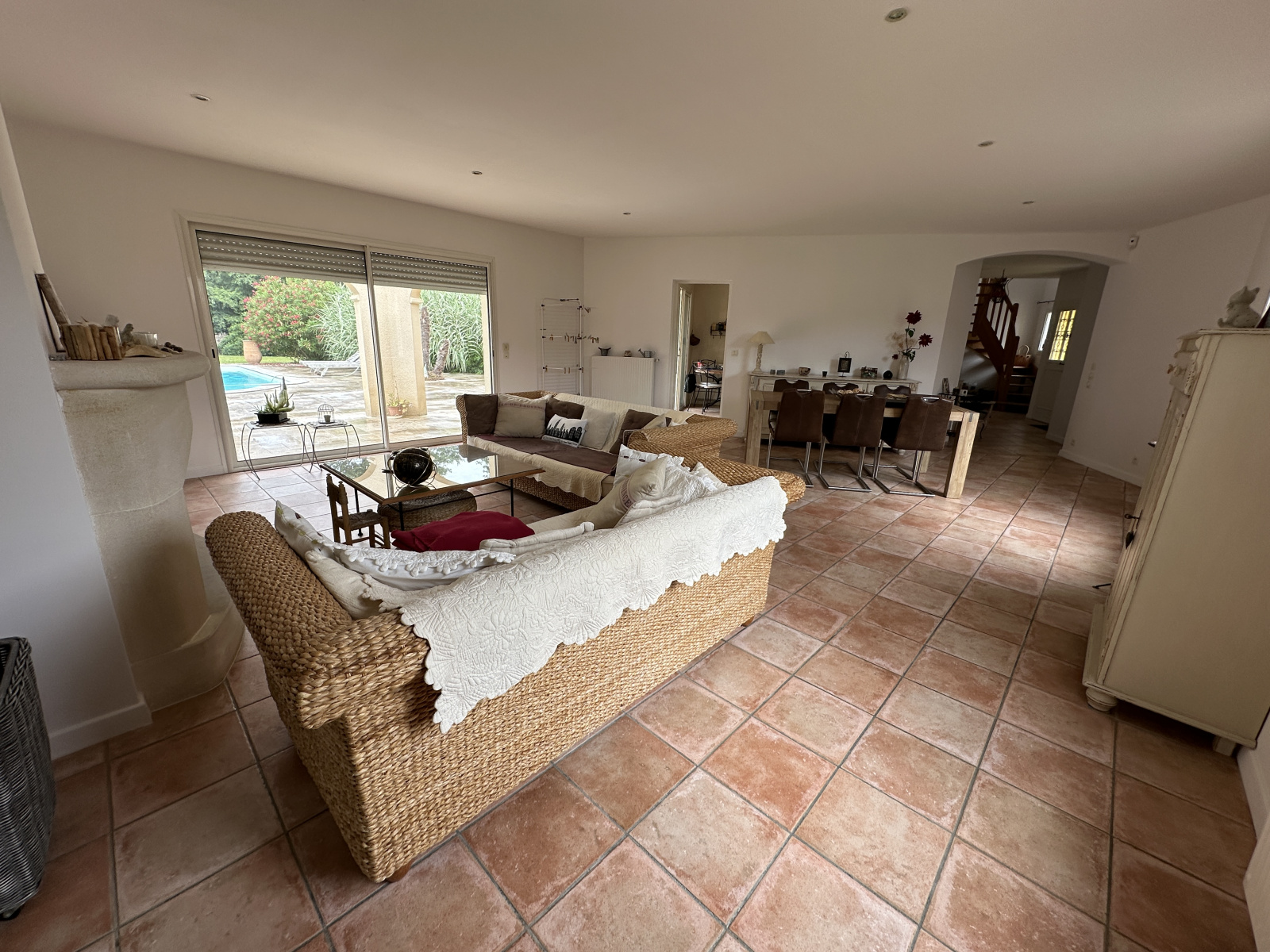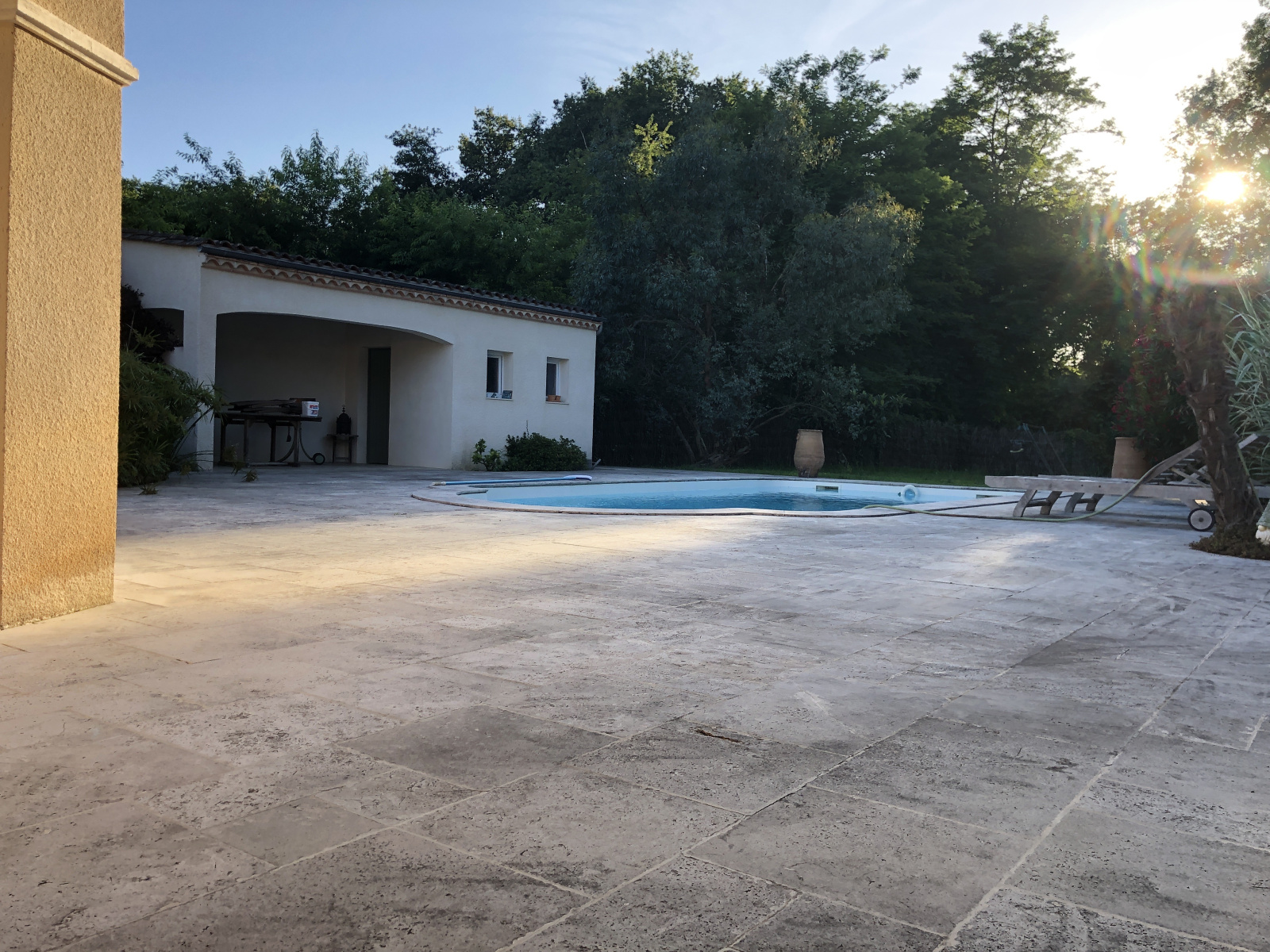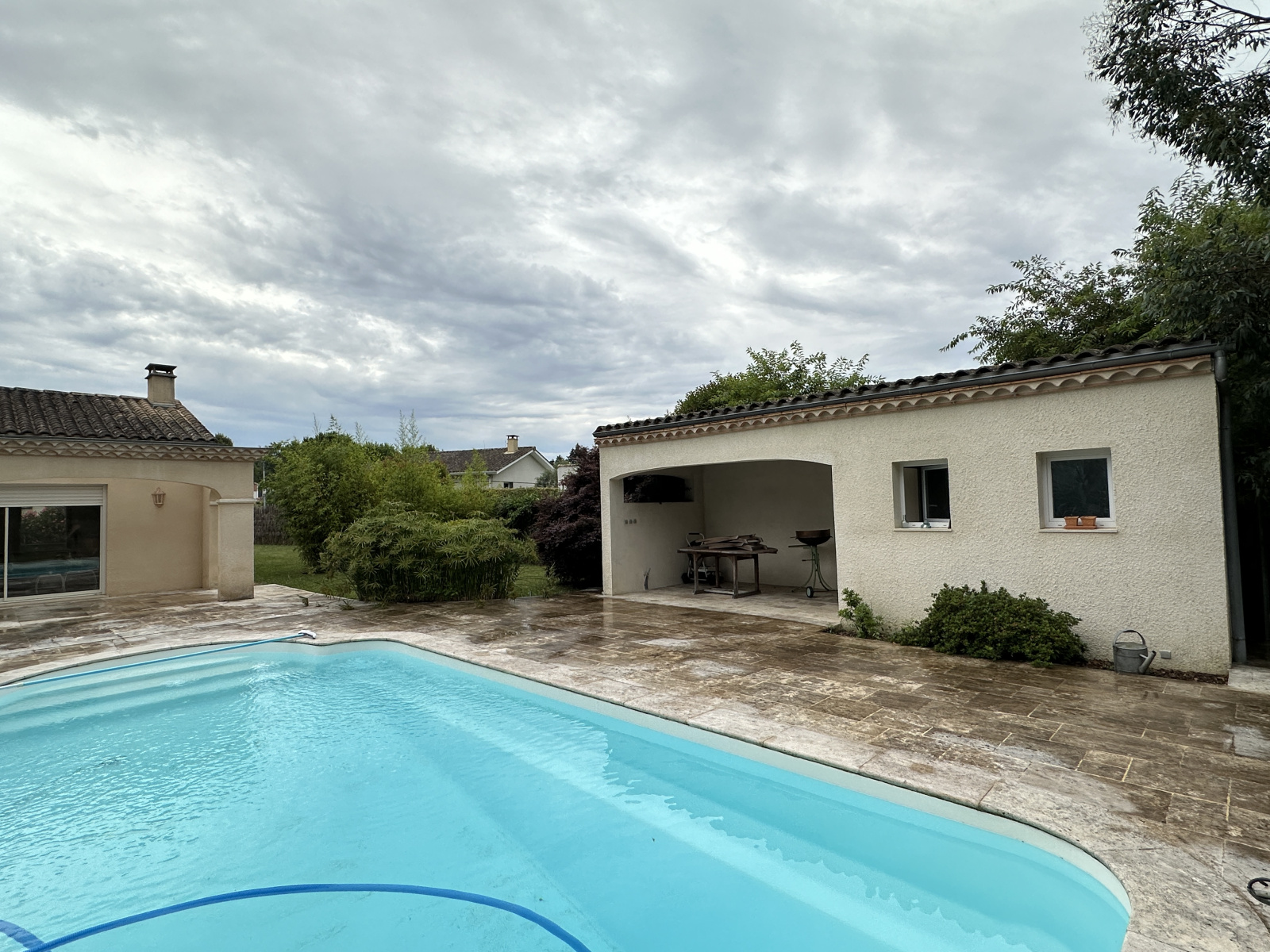 A l'extérieur, vous profiterez de la quiétude des lieux avec une terrasse en travertin de 200 m² environ entièrement carrelée avec une piscine de 9 x 4.20 au sel, un pool-house comprenant douche WC et terrasse couvertre.