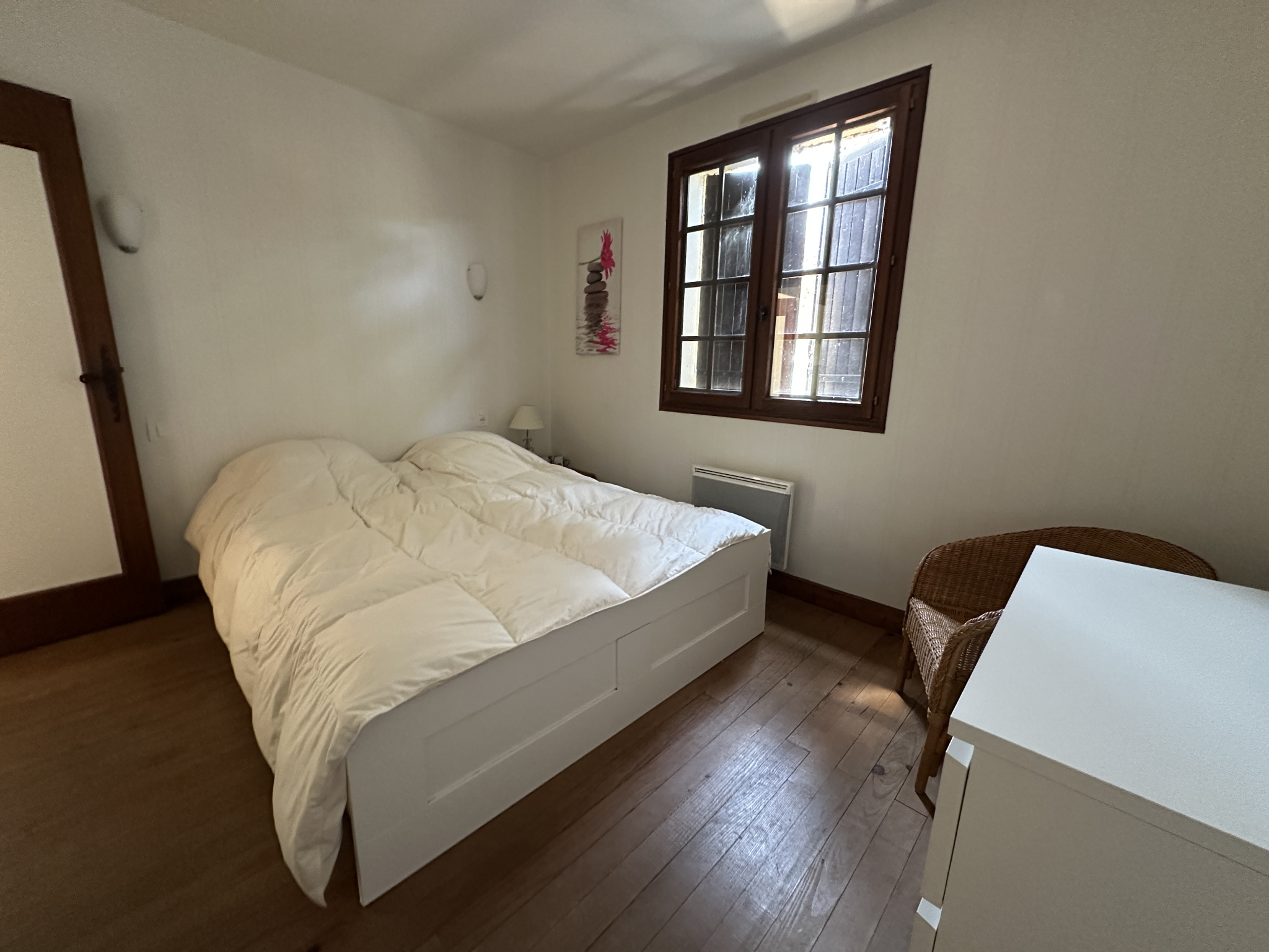 Elle offre un salon-salle à manger avec insert bois, une cuisine séparée, trois chambres dont une suite parentale avec salle d’eau, ainsi qu’une salle de bains indépendante avec WC et un second WC séparé.