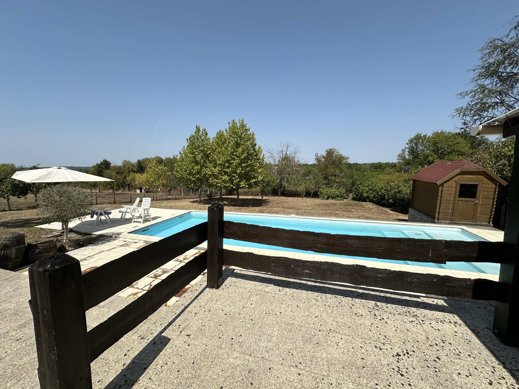 Côté extérieur, laissez-vous tenter par la piscine chauffée (sel + chlore), la terrasse couverte avec vue sur le jardin et la piscine, et la grande véranda carrelée idéale en toute saison. L’ancien terrain de pétanque ne demande qu’à être remis en état pour devenir le cœur de vos soirées d’été.