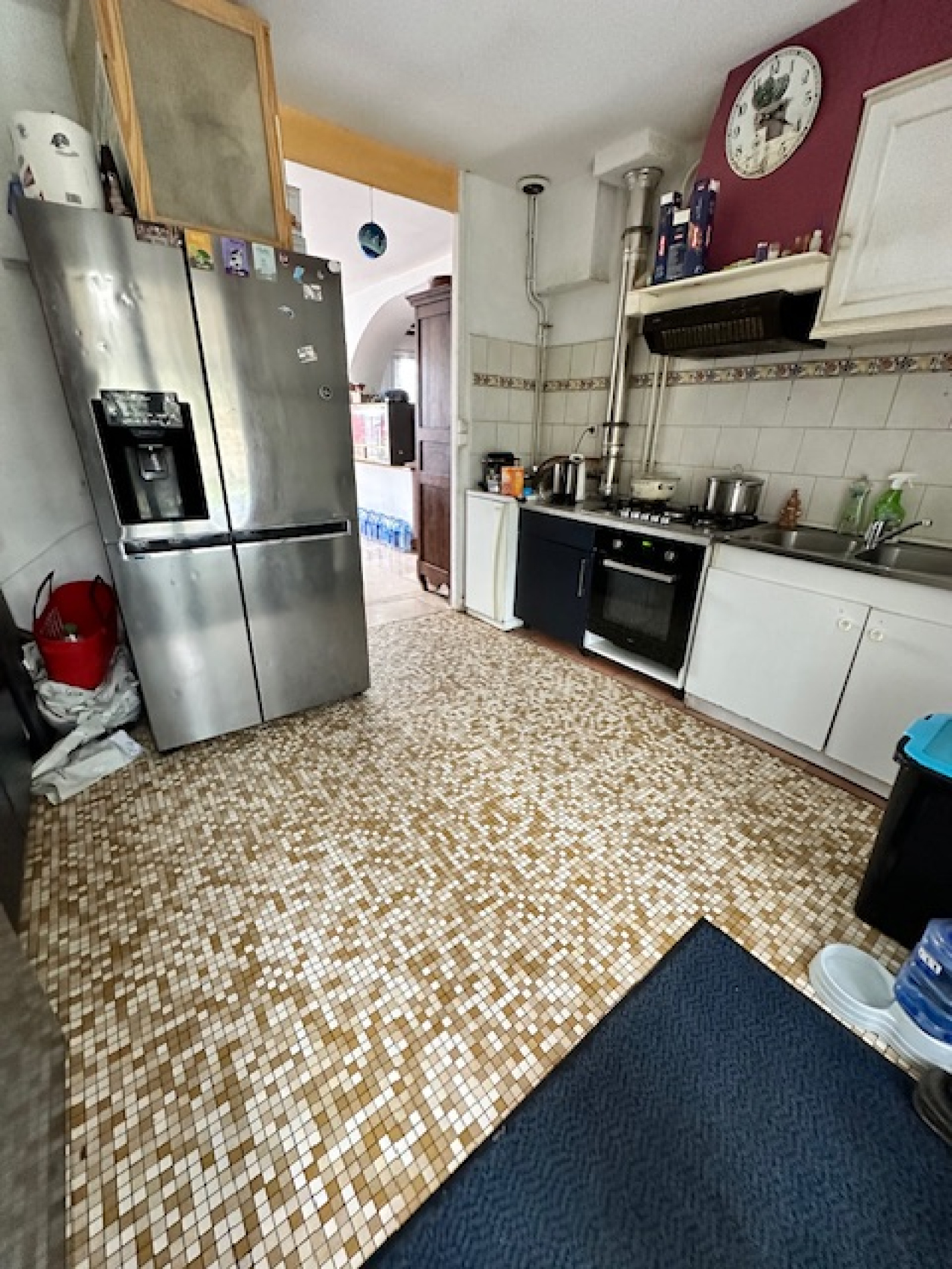Elle comprend cuisine, salon/séjour avec insert, 3 chambres ( 9, 12 et 14m2 ) avec placard pour deux d'entre elles, salle d'eau, WC et préau