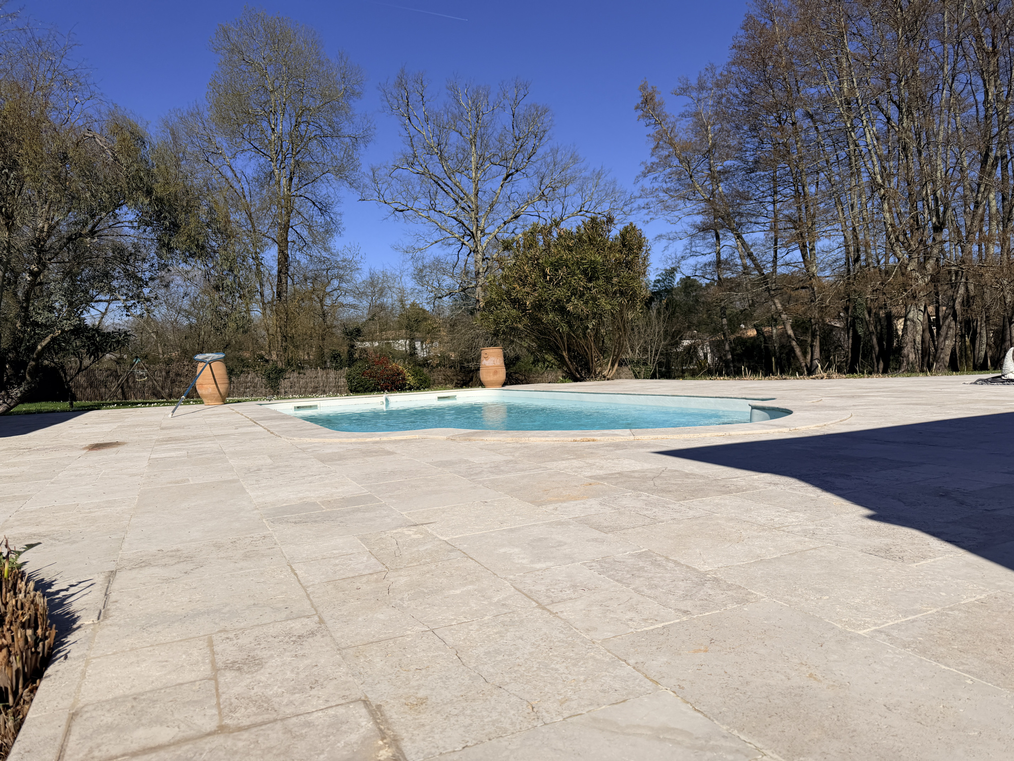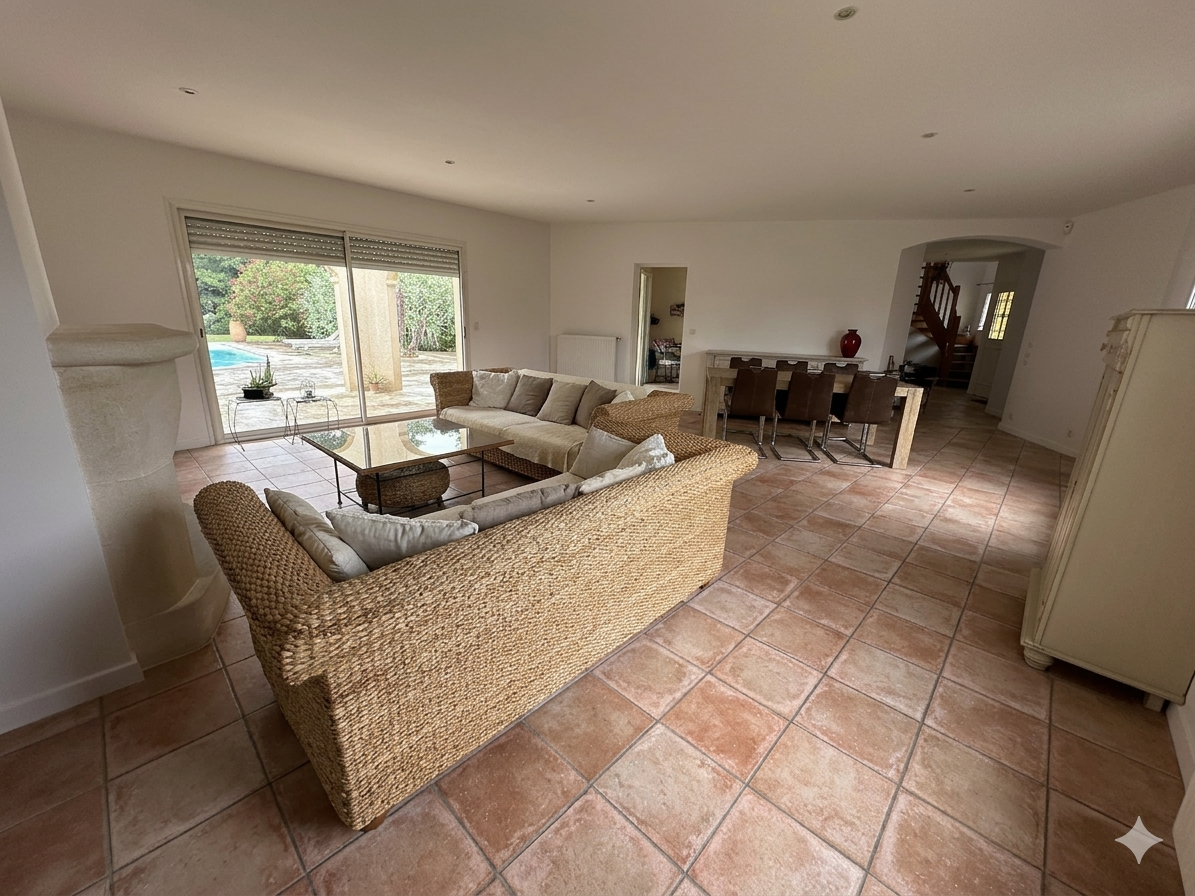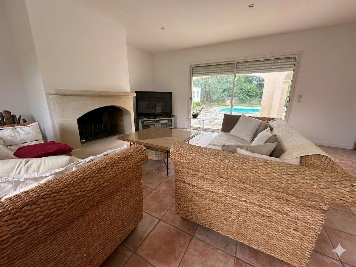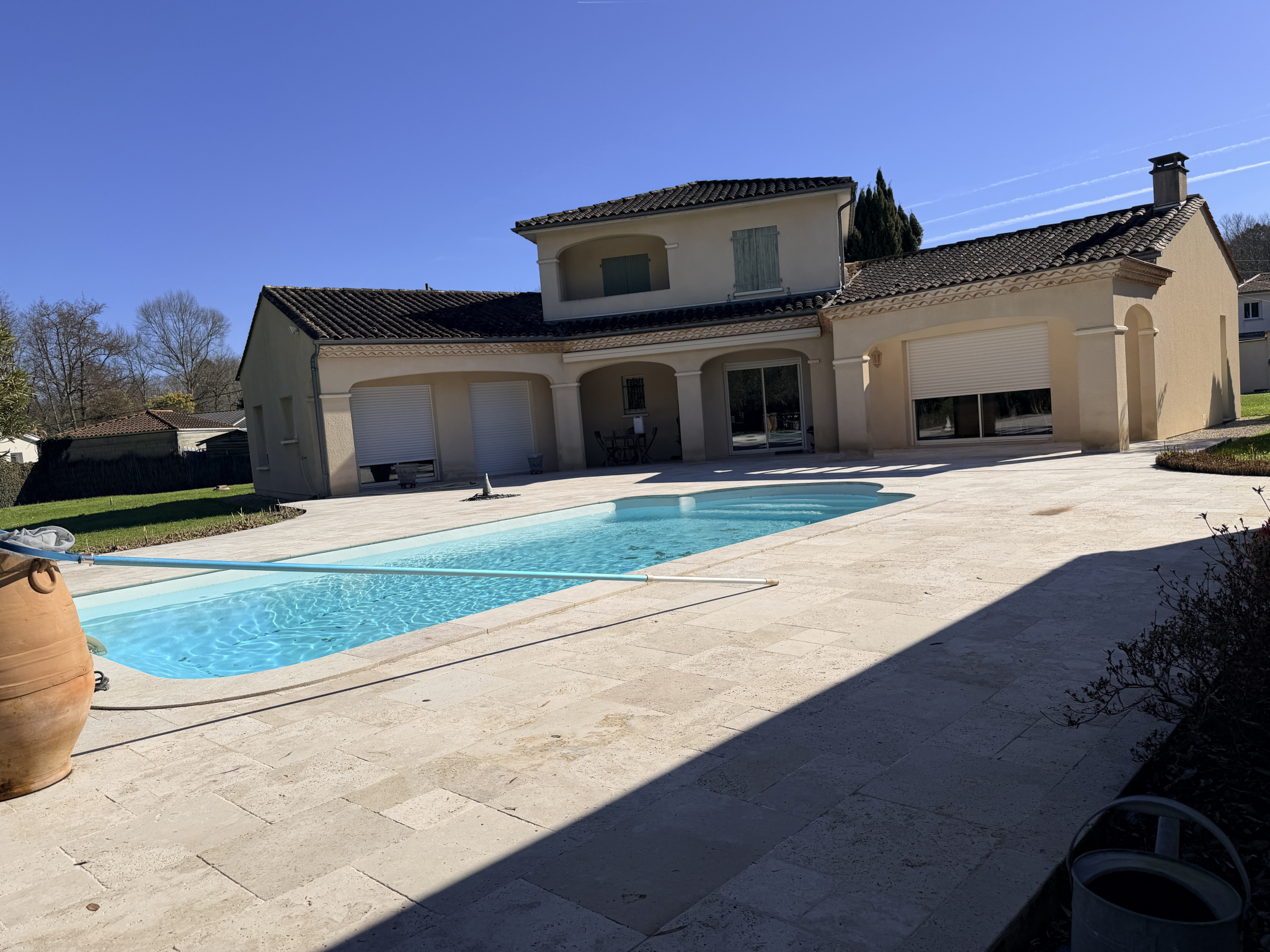 A l'extérieur, vous profiterez de la quiétude des lieux avec une terrasse, entièrement carrelée en travertin de 200 m² environ avec une piscine de 9 x 4.20 au sel, un poolhouse comprenant douche WC et terrasse couverte.