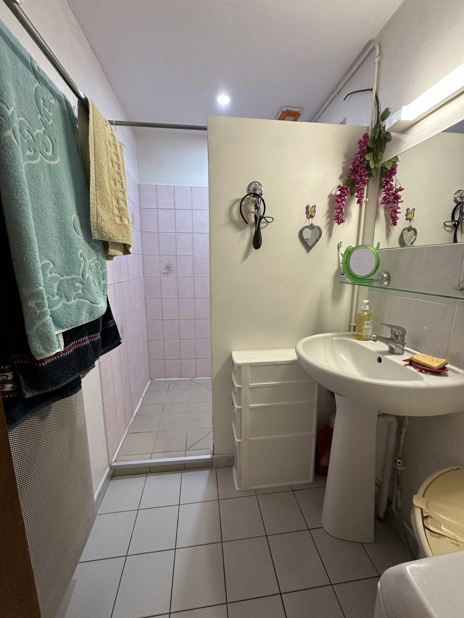 La salle d’eau est équipée d’une douche à l’italienne et de branchements pour machine à laver, tandis que les WC sont séparés pour plus de confort.