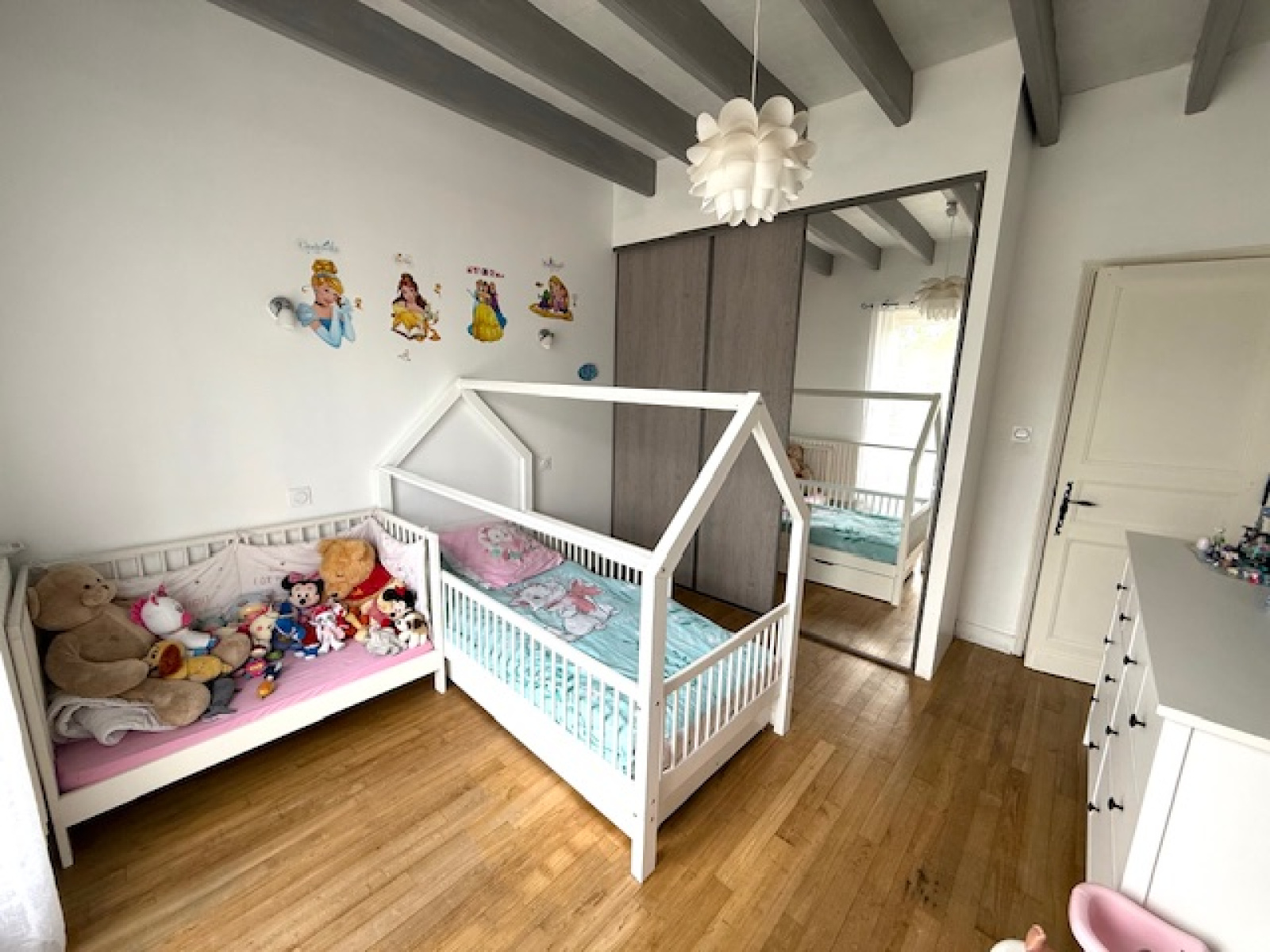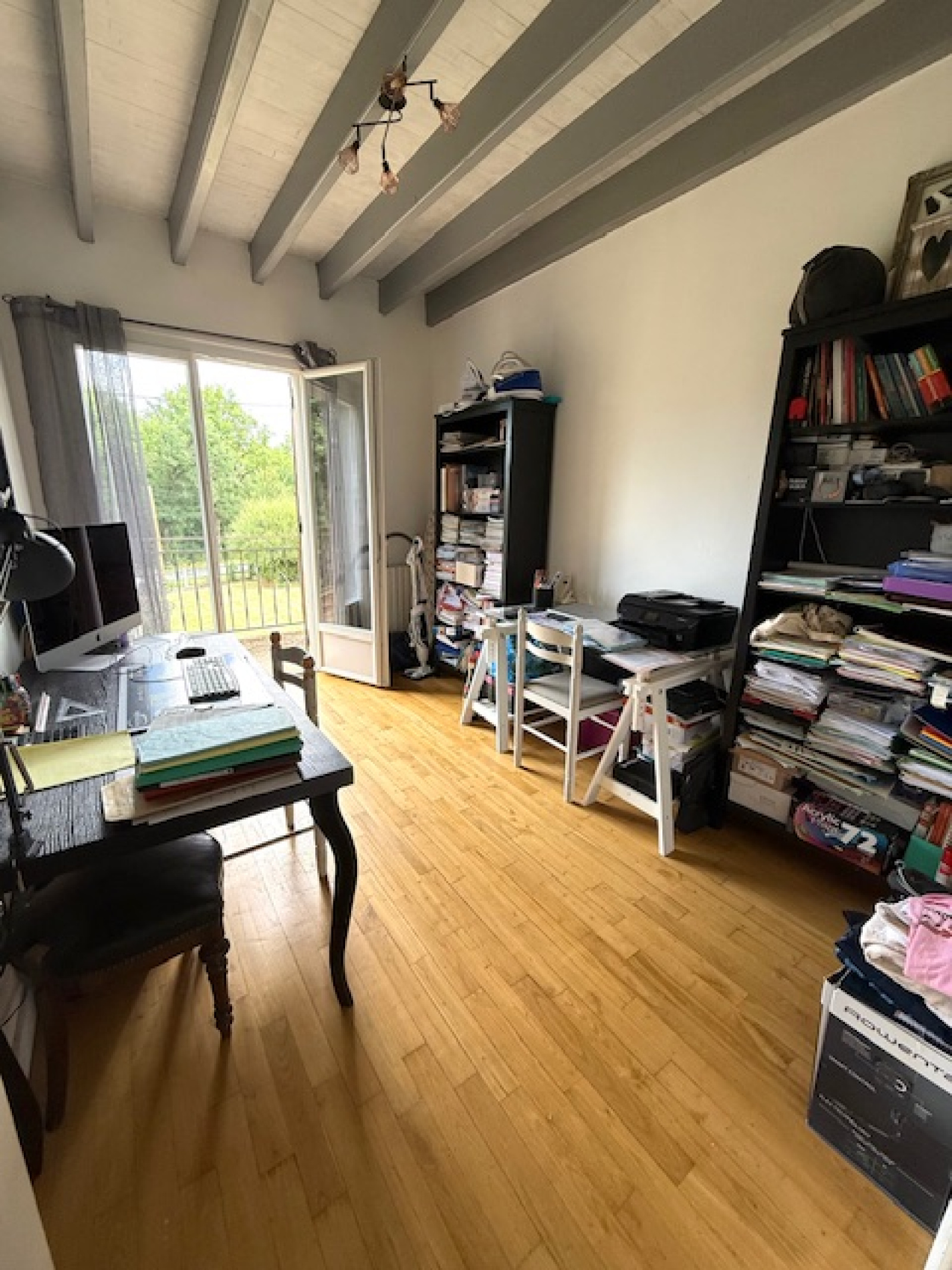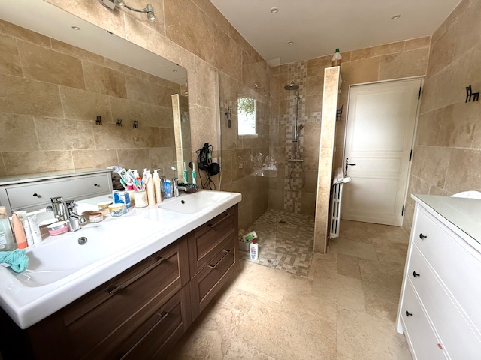 La maison comprend de plain pied entrée, cuisine ouverte sur salon/séjour avec cheminée à foyer ouvert donnant sur une grande terrasse, deux chambres avec placard, bureau, salle d'eau, WC et à l'étage mezzanine, trois chambres et salle d'eau avec WC.