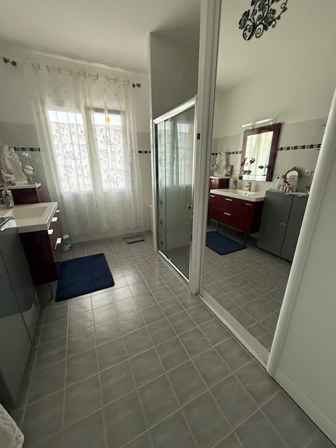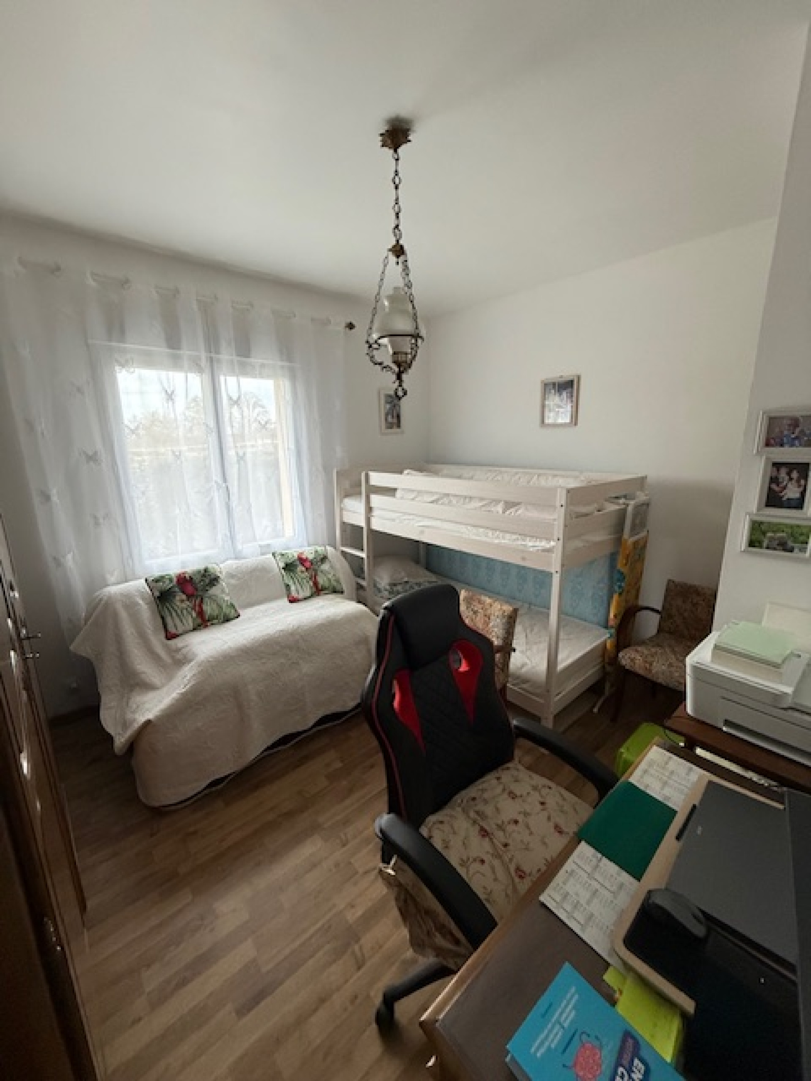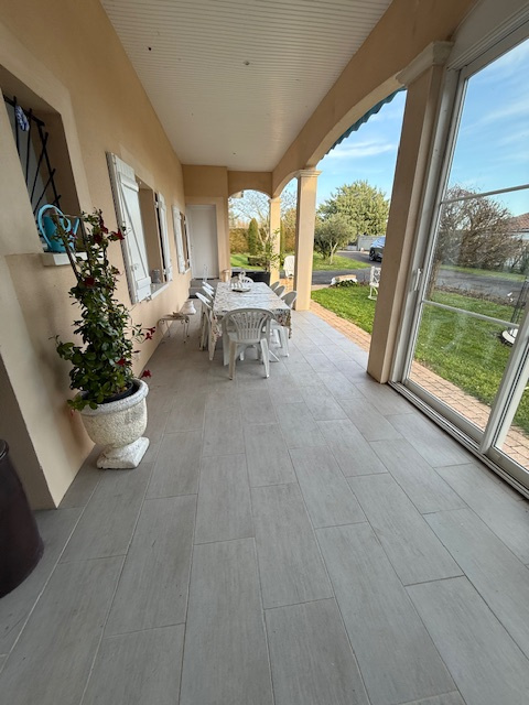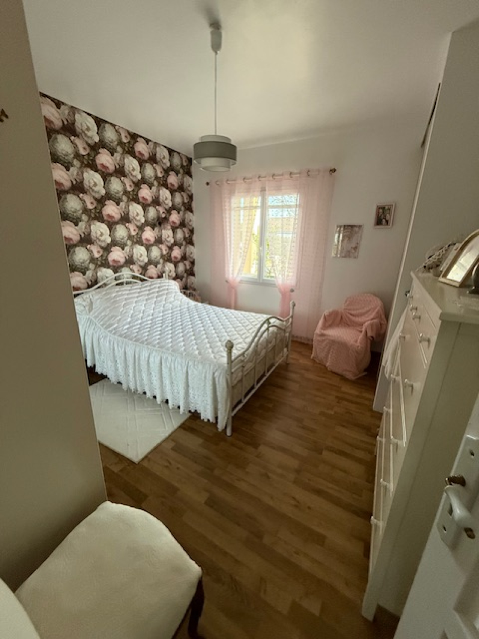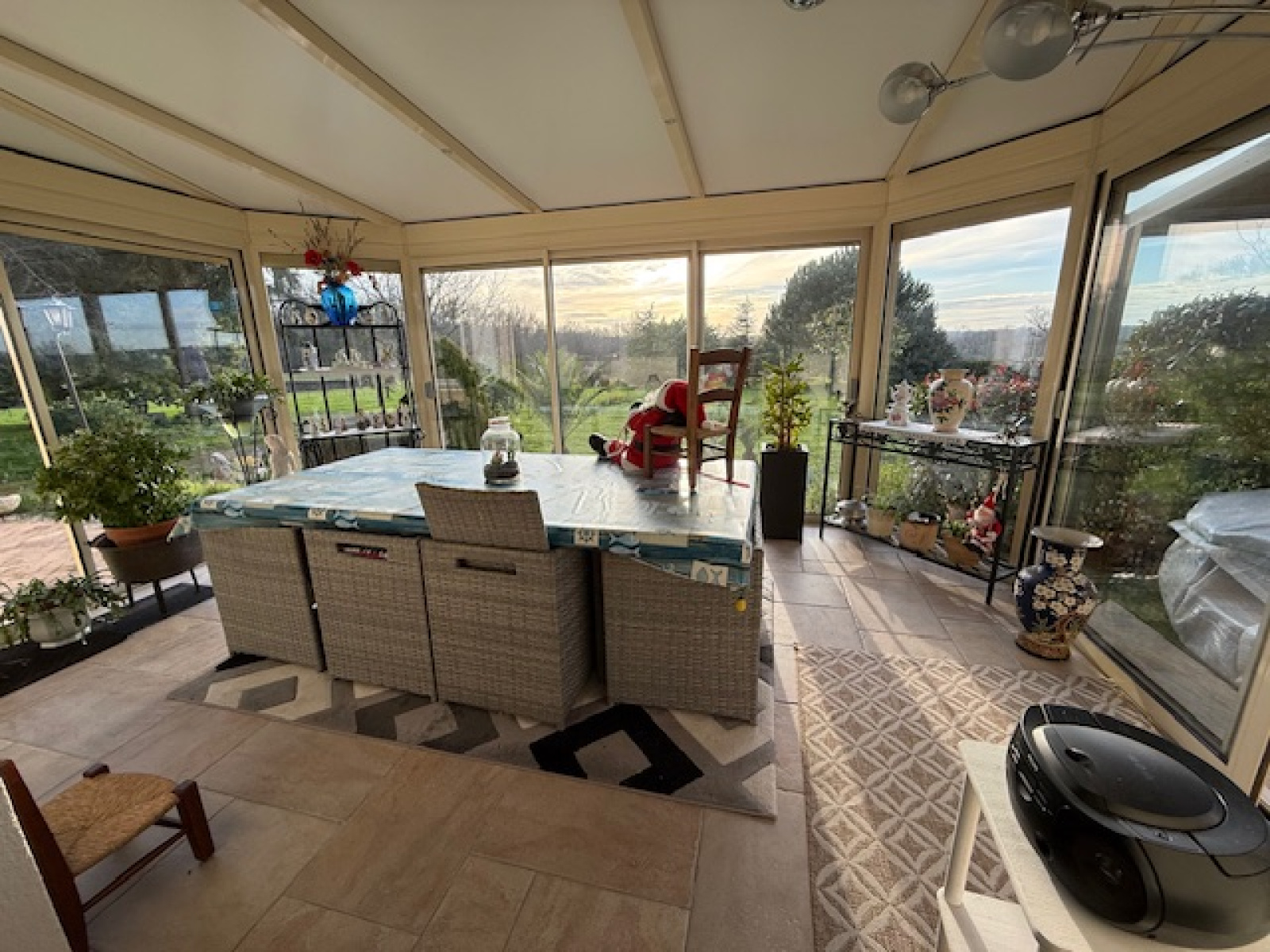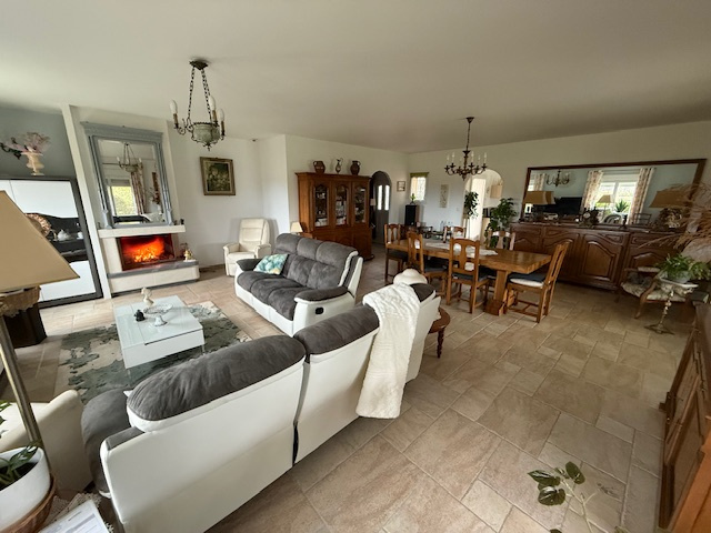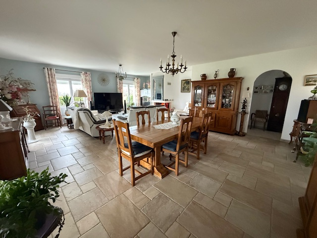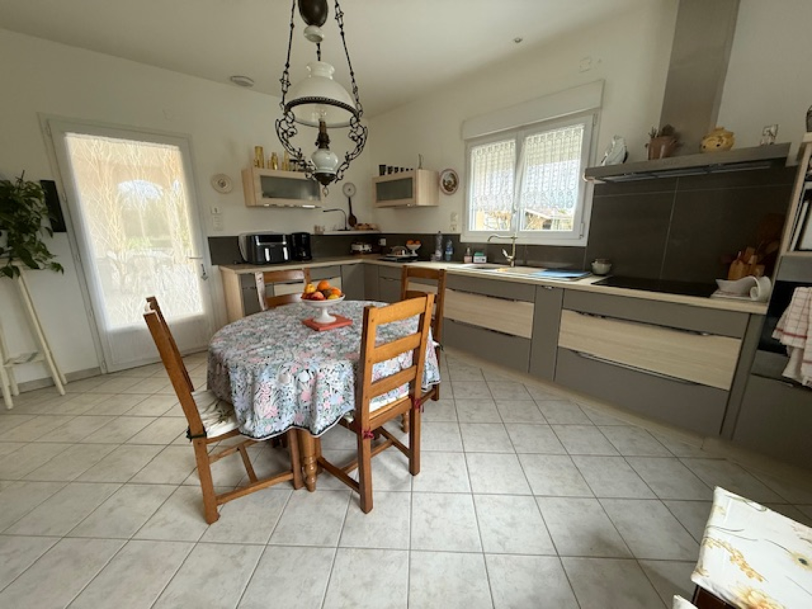 Elle comprend de plain pied entrée, 3 chambres ( 14, 14 et 12m2 ), cuisine meublée et équipée, salon / séjour avec insert de 55 m2, véranda non chaufée de 16m2, salle d'eau avec douche italienne et placard, WC avec lave mains et un grand garage avec partie cellier de 45m2 permettant la création à souhait d'une suite parentale et de conserver un espace de stationnement.