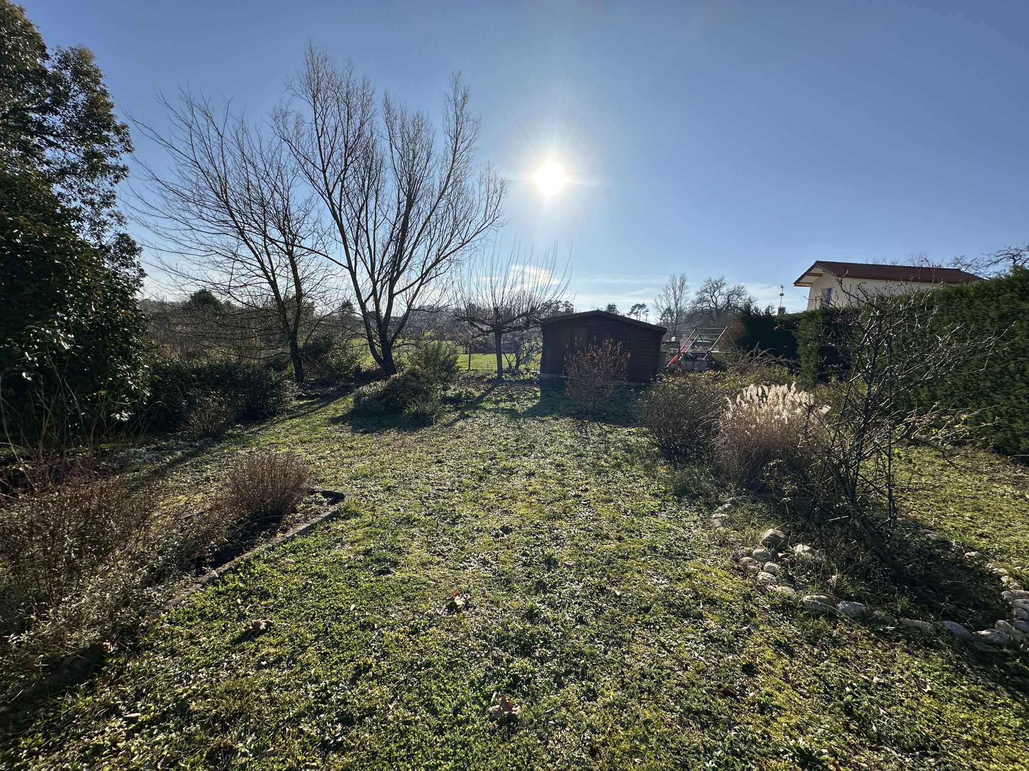 À l’extérieur, le bien dispose d’un terrain semi-clos, d’une allée goudronnée facilitant le stationnement, ainsi que de deux cabanons de jardin offrant des espaces de rangement supplémentaires.