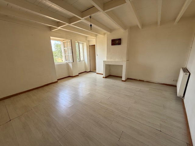 Elle est composée d'une cuisine ouverte sur salon/séjour avec cheminée, chambre, bureau, salle d'eau, WC et cellier.
